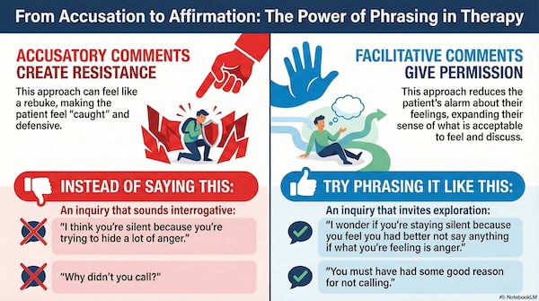 Dominar esta postura esencial capacita al terapeuta para encontrar formas eficaces y empáticas de expresar sus observaciones, lo que permite al paciente integrar esas percepciones en un sentido más expansivo de sí mismo, en lugar de sentirse humillado o disminuido. Al adoptar este enfoque, las palabras intercambiadas se convierten en la herramienta curativa que facilita el cambio psicológico duradero.